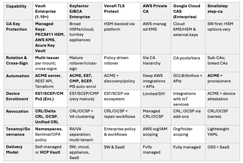 Vault PKI vs EJBCA vs Venafi vs AWS Private CA vs Google Cloud CAS vs Smallstep (Feature Comparison)
